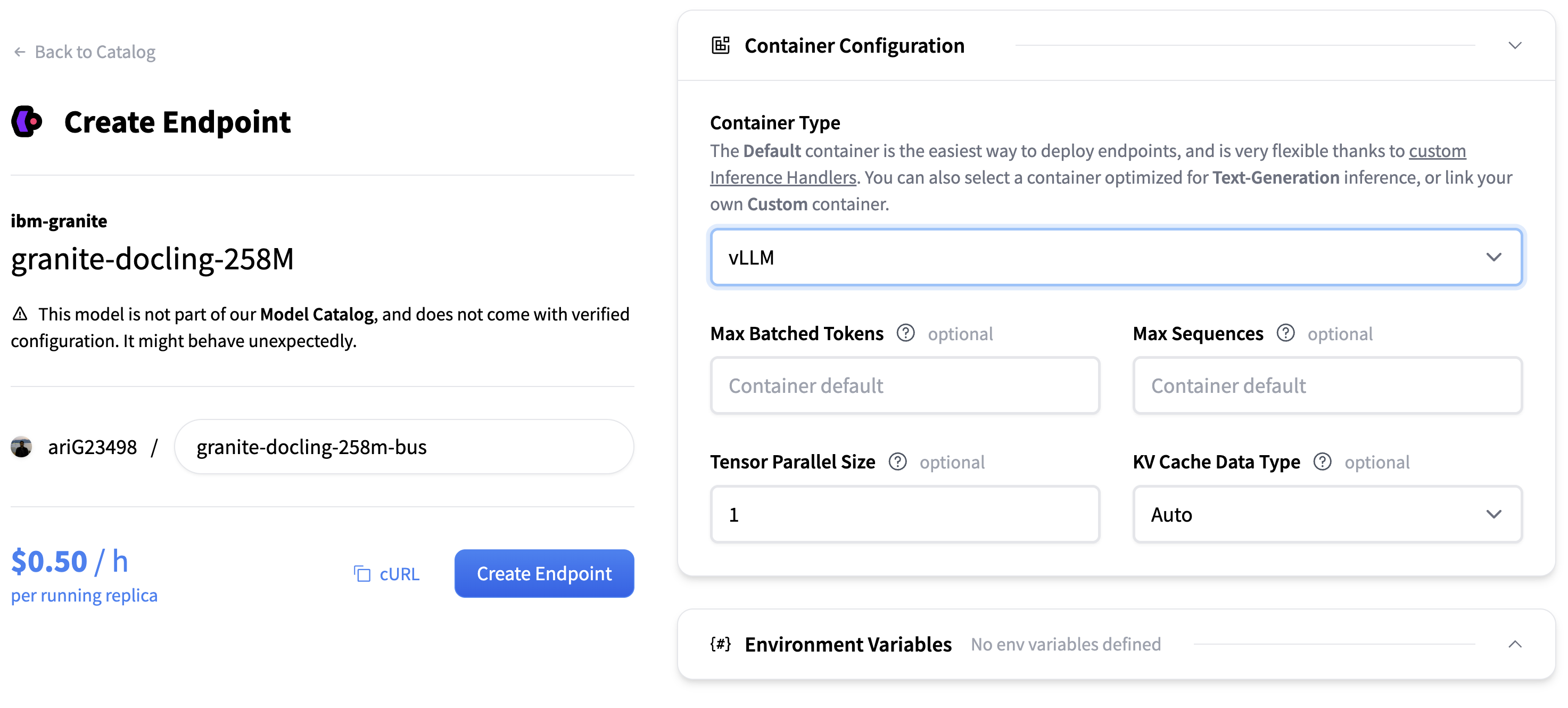 vLLMas the container type and finalize the deployment pressing Create Endpoint. -